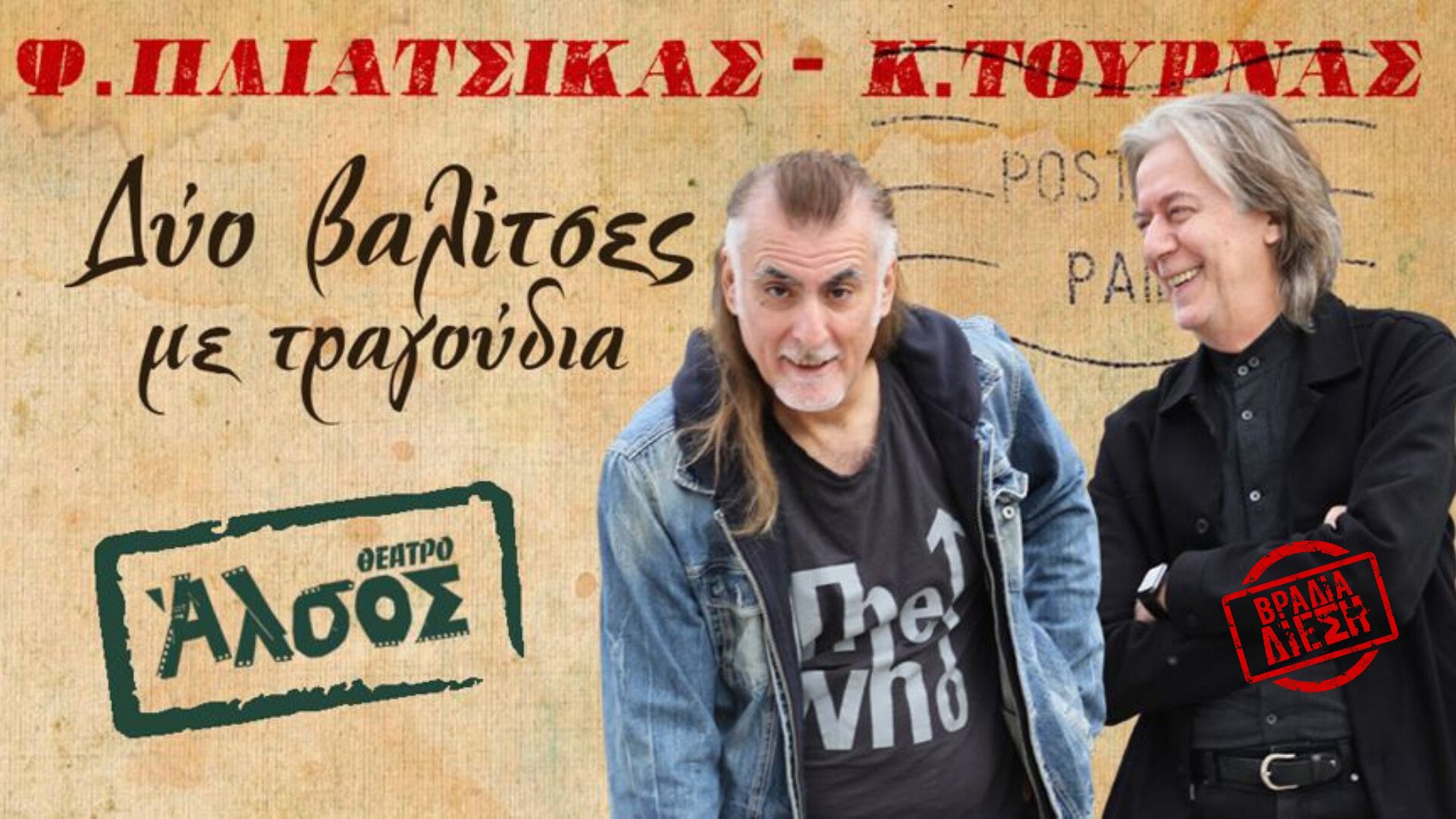 Κώστας Τουρνάς και Φίλιππος Πλιάτσικας, συναντιούνται -για πρώτη φορά επί σκηνής- και ενώνουν τις φωνές τους στο Θέατρο ΄Άλσος!