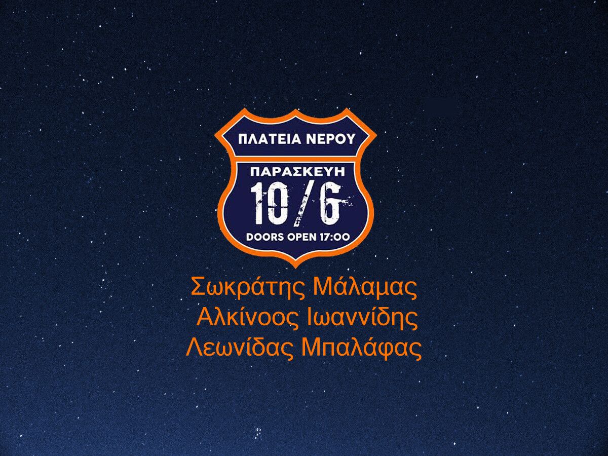 Ο Σωκράτης Μάλαμας, ο Αλκίνοος Ιωαννίδης και ο Λεωνίδας Μπαλάφας, εκπρόσωποι και οι τρεις μιας απαιτητικής και εντελώς διαφορετικής στον καθένα τραγουδοποιίας, κατεβαίνουν στηνΠλατεία Νερού, για μια μοναδική συναυλία, την Παρασκευή 10 Ιουνίου.