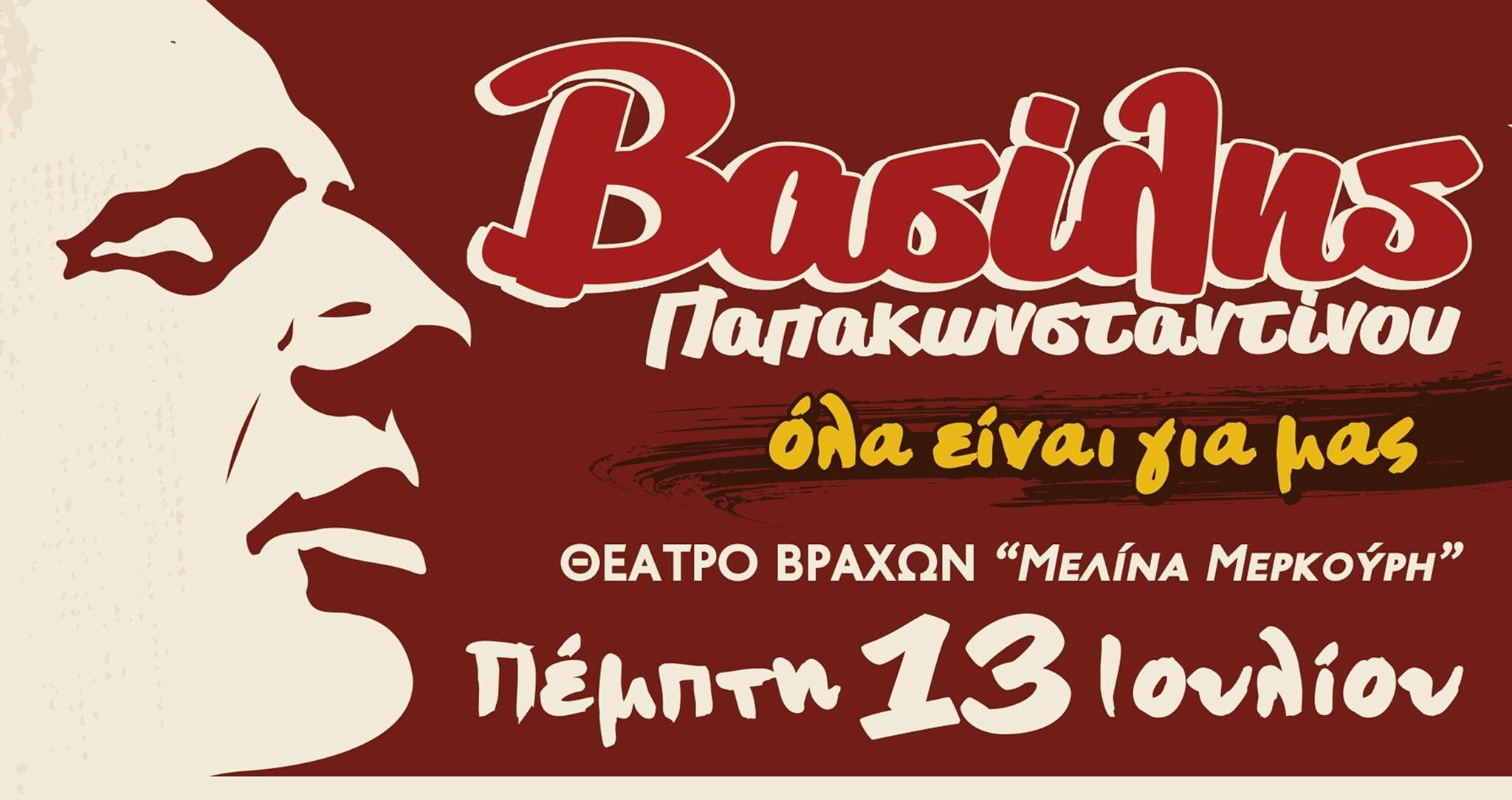 Ο Βασίλης Παπακωνσταντίνου – απλά Βασίλης για τους φίλους του – έρχεται στο Θέατρο Βράχων «Μελίνα Μερκούρη» στον Βύρωνα, την Πέμπτη 13 Ιουλίου , στήνοντας μια συναυλία γεμάτη ρυθμό και συγκίνηση.
