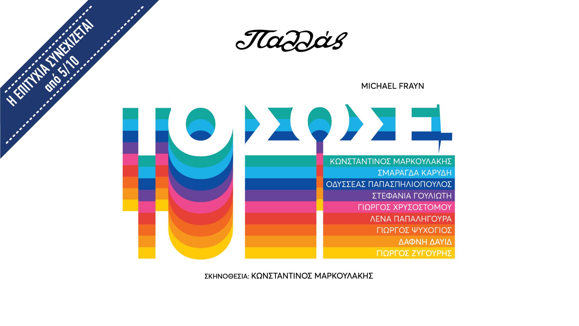 Ο Κωνσταντίνος Μαρκουλάκης υπογράφει την σκηνοθεσία μιας καθαρόαιμης κωμωδίας, επιστρατεύοντας έναν all-star θίασο, με τον ίδιο να ανεβαίνει επίσης στη σκηνή. Μαζί του, στο οργανωμένο χάος αυτής της αριστοτεχνικά γραμμένης κωμωδίας, πρωταγωνιστούν η Σμαράγδα Καρύδη, ο Οδυσσέας Παπασπηλιόπουλος, η Στεφανία Γουλιώτη, ο Γιώργος Χρυσοστόμου και η Λένα Παπαληγούρα. Την ομάδα συμπληρώνουν ο Γιώργος Ψυχογυιός, η Δάφνη Δαυίδ και ο Γιώργος Ζυγούρης.